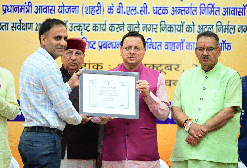 स्वच्छता सर्वेक्षण 2024-25 में उत्कृष्ट प्रदर्शन करने वाले नगर निकायों को अटल निर्मल नगर पुरस्कार प्रदान किए गए। पुरस्कार वितरण समारोह में सीएम धामी ने विजेताओं को सम्मानित किया: